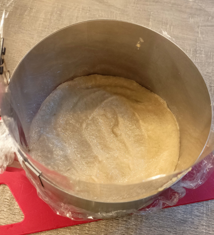 Вот теперь я уже думаю, что надо было сначала вокруг коржа накинуть ацетатную пленку, сверху кольцо, затянуть все это и потом вниз плёнку подсунуть, было бы проще