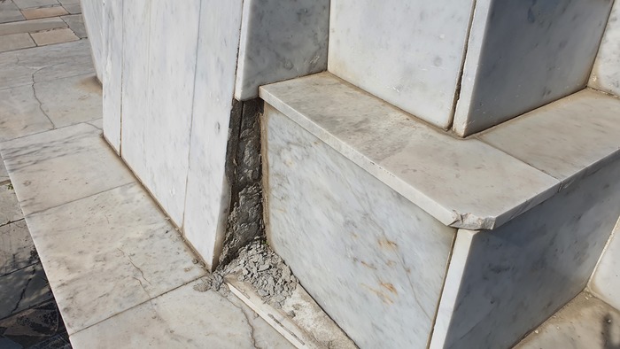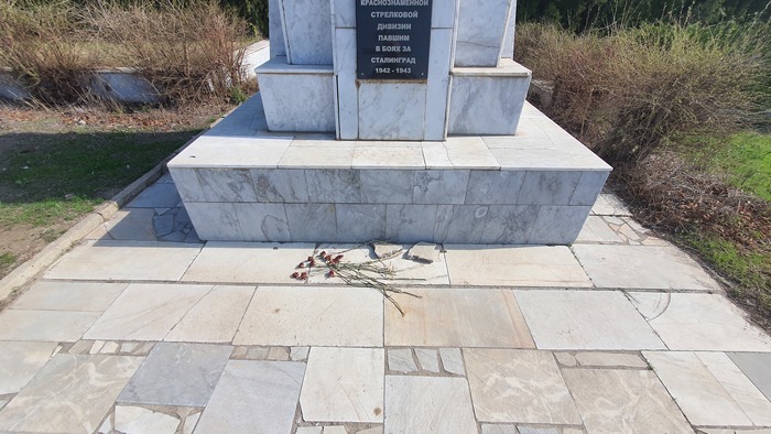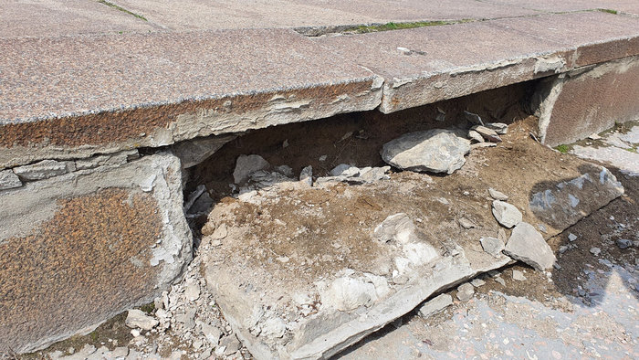 По всему периметру постамента видны многочисленные трещины, наспех заделанные раствором. Некоторые из гранитных плит и вовсе отвалились, а чтобы не вызывать подозрения, просто «аккуратно» приставлены, и неровен час могут упасть на кого-нибудь из детворы.