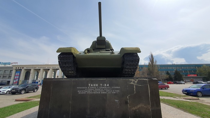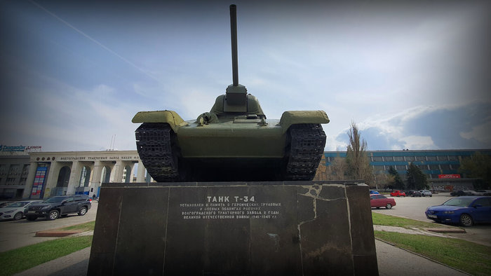 Речь идет о танке Т-34 на площади имени Ф.Э. Дзержинского, около центральных проходных Волгоградского тракторного завода (до 1961 года Сталинградский тракторный завод), ныне закрытого и разрушенного.