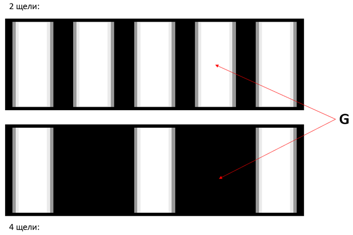 Идите нахер второй раз, потому что мы увидим больше тёмных промежутков. Почему две новых дырки затемняют то место, где раньше был свет (я его обозначил точкой G)? Почему света стало меньше, если дырок - больше? И наш учёный начинает экспериментировать. Идём по чек-листу: