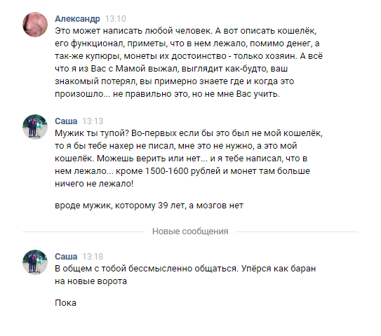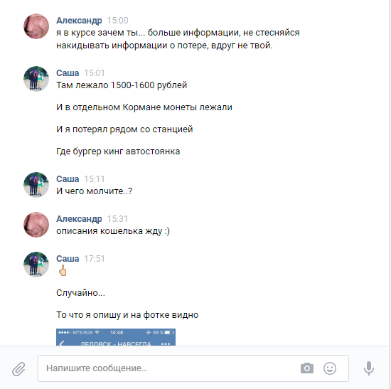 4. 22го (ДР у меня :)) начался легкий треш: написала мама мальчика, сказала что их, назвала дату и сумму, на просьбу описать точнее кошелек и содержимое, сказала: будут вспоминать. Попросил, что-бы ее сын сам мне написал... (вообще, мне кажется, я пишу больше чем они). Он написал, см. скрин :) может я плохо сформулировал просьбу описать кошелек и его содержимое... Но человек не хочет или может описать свой кошелек...