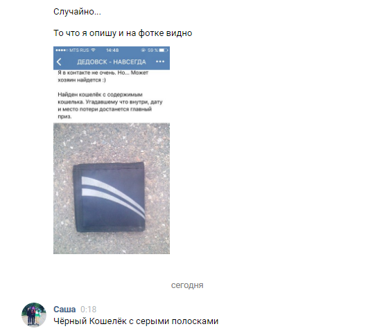 3. 21го выложил в ВКонтакте, на сайте города фото и просьбу описать кошелек и содержимое, дабы вернуть владельцу.