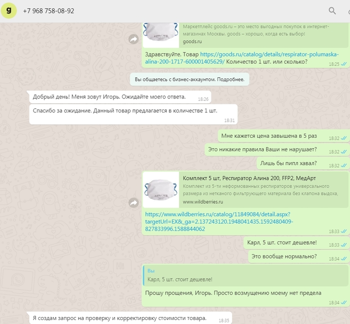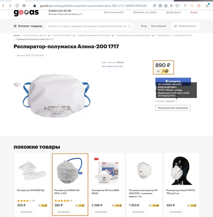 Извините, конечно, пикабутяне, ну всё же поделюсь. Меня прям бомбит. Случайно увидела цену на респиратор Алина 200 на goods.ru за 890 руб. за штуку! Вот ссылка https://goods.ru/catalog/details/respirator-polumaska-alina-...
