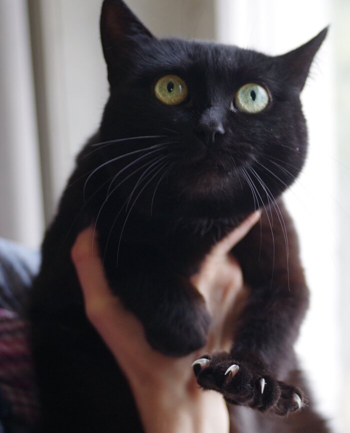 Кошке Баське примерно 8-10 лет, стерилизована. Она воспитанная, умная, не навязчивая, но сейчас очень скучает по людям. Поэтому её решительно невозможно хорошо сфотографировать, - она так рада людям, что не может сидеть спокойно - вьется вокруг, тарахтит, как трактор.
