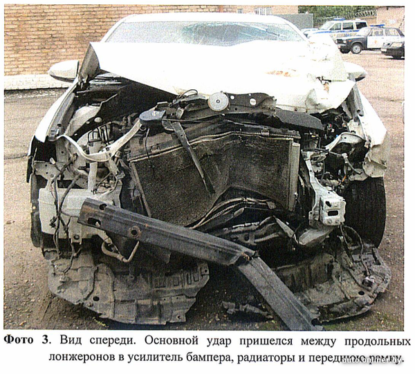 Внешне осмотрев повреждения автомобиля, специалисты сделали ряд замечаний. Нам показался любопытным вот этот пункт: «Силовая структура кузова не получила повреждений, необходимых для развертывания подушек безопасности: отсутствует деформация передних лонжеронов вдоль их продольной оси и боковых стоек вдоль поперечной оси автомобиля. Повреждения навесных кузовных деталей (капот, крылья, бампер, двери), панели крыши, передних стоек ветрового стекла не могут вызвать необходимого для раскрытия подушек безопасности замедления автомобиля, т. к. являются легкодеформируемыми деталями, не обладающими достаточной жесткостью. Опасности проникновения силового агрегата в салон нет».