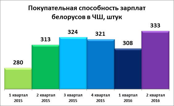 Как подсчитали авторы индекса, в среднем по итогам второго квартала белорус мог купить 333 чарки и шкварки – абсолютный рекорд за последние полтора года. В первом квартале вышло всего 308 ЧШ, во втором квартале 2015-го – 313 ЧШ. Даже в относительно сытом 2014-ом было меньше: два года назад среднестатистический белорус зарабатывал лишь 290 ЧШ.