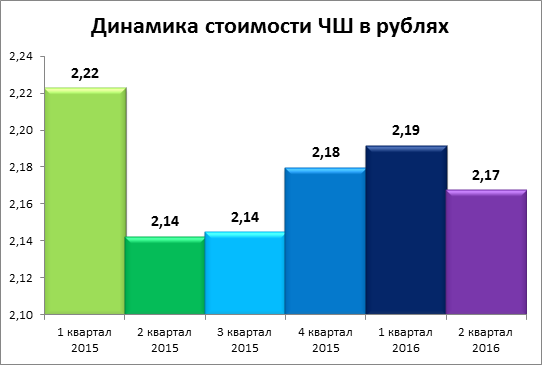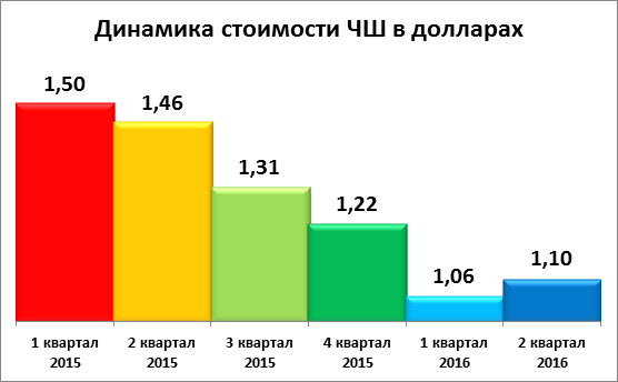Еще интереснее рассмотреть динамику стоимости ЧШ в долларовом эквиваленте. Невероятно, но факт: она стремительно падает. Во втором квартале 2016 года 100 грамм свинины и столько же водки стоили всего 1,1 доллара. Для сравнения: в аналогичном периоде прошлого года стоимость ЧШ составляла 1,46 доллара, а в 2014 году – 2,05 доллара. Итого за два года – падение цены почти в два раза.