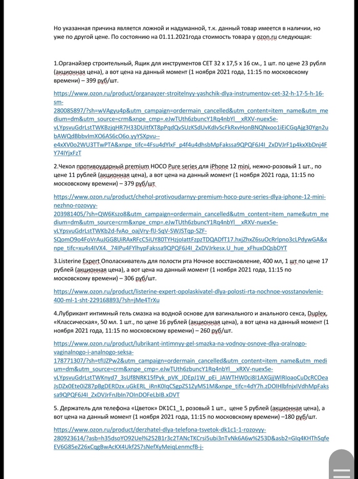 Нужна помощь юристов или просто знающих людей. Ночью 1 ноября я приобрёл в интернет магазине Озон товар по скидке. Скидки были очень большие, порядка 97%. Товар добавил в корзину, выбрал способ и сроки доставки, оплатил. Утром 1 ноября я получаю уведомление, что часть товар мне на доставят и оформили возврат средств. И как вы думаете каких товаров? Верно! Акционные! Причина - товара нет в наличии. Зашёл проверить, а товар в наличии, но цена уже совершенно другая. Вспоминаю, что уже читал пост о подобной ситуации. Нашел его, взял пример обращения и написал в Озон и Роспотребнадзор. Озон ответил сразу. Ответы были как от юристов, так и из отдела по работе с клиентами. Все они сводились к следующему: мы не виноваты, ничего вам не продадим по тем ценам, делайте что хотите. Обидно, знаете ли.