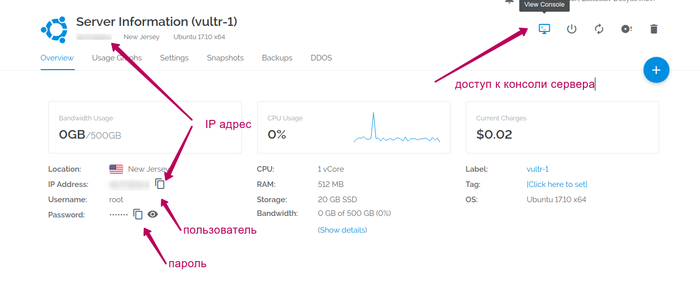 На странице конкретного сервера будет информация для подключения по SSH. Если эти три буквы видите впервые, то жмём кнопку "View Console"