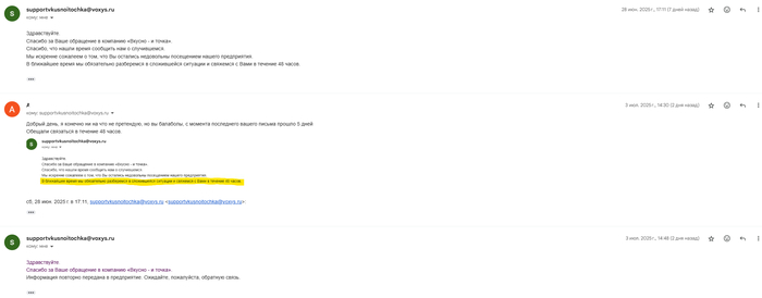 Всегда нормально относился к этой сети, как минимум как к достойной альтернативе шаверме или прочей еды такого класса, которой можно перекусить где-то недалеко от объекта, вкус давно приелся, но качество норм и хотя бы можно быть уверенным в том, что после посещения такого заведения не придется бежать в туалет. Но собственно о чем я, пока это был макдак они очень оперативно реагировали на каки-либо косяки со своей стороны, если задерживали заказ, извинялись давали какие-то бонусы к нему и.т.д. А сейчас столкнулся с тем, что им просто на все насрать, не нравится что-то ну и не ходите. А теперь к сути: был пару недель назад в 1 точке этой сетки в СПб(точка проблемная как оказалось, по отзывам в яндекс картах) сделал там с товарищем заказ на вынос и... прождал заказ 1час и таких как я было еще человек 20, просто коллапс, у них там сломалась система или еще что, но мобильные заказы продолжали принимать, персонал не знал что делать, а главное не видел заказов и не мог их готовить, кое как по скринам заказов с телефонов они начали выдавать заказы. На тот момент, когда мы все же получили свой заказ в зале оставалось еще человек 10 таких же бедолаг и подходили новые. Понятное дело что в эту нору фекаллоида мы больше не пойдем, но суть поста не в этом, суть поста в реакции службы поддержки, которая получила жалобу на работу своей точки день в день, обещала дать обратную связь в течение 48 часов а в итоге просто пересылает 2 недели 1 и тоже письмо с отпиской и до сих пор нет никакого ответа.