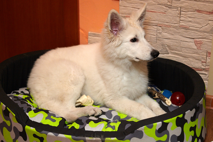 Правда, такая ситуация сохранялась очень недолго. Конкретно, одну ночь. Уже на утро пес смог покорить эту вершину, и зацепился лапами за край кровати. Т.е. он прибавил в росте 1-2 см.