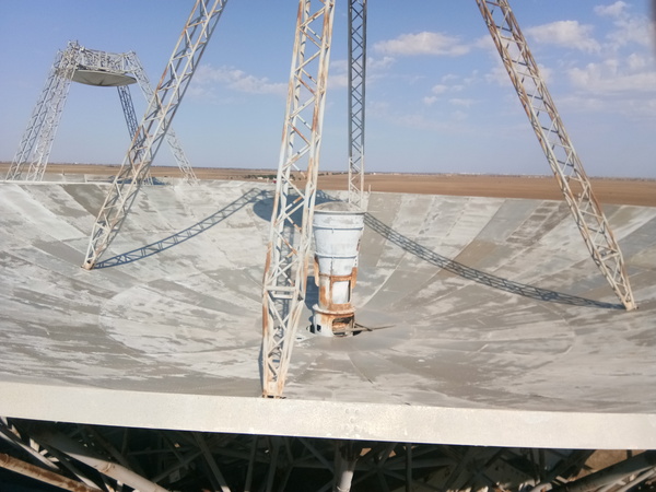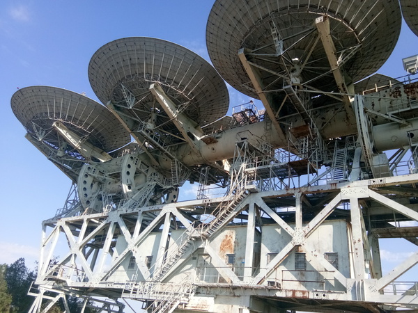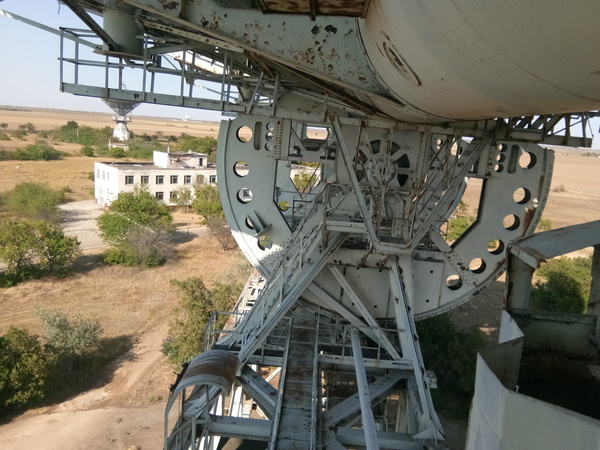 Эта приемная антенная входит в комплекс приемо-передающих антенн АДУ-1000, которые входят непосредственно в сам комплекс "Плутон". Антенна из себя представляет антенную решетку 2*4 зеркальных параболических антенн, конструкция установлена на сваренных корпусах подводных лодок, которые, в свою очередь, установлены на часть железнодорожного моста, который стоит на башне от линкора, что делает эту антенну полноповоротной. В 60-70-е года активно использовалась и была крупнейшей антенной, но после развала СССР и перехода Крыма к Украине про нее забыли, после воссоединения Крыма с Россией Роскосмос также не горит желанием ее восстанавливать, оно и понятно, слишком дорого, но это, как я считаю, шедевр антеннострония.