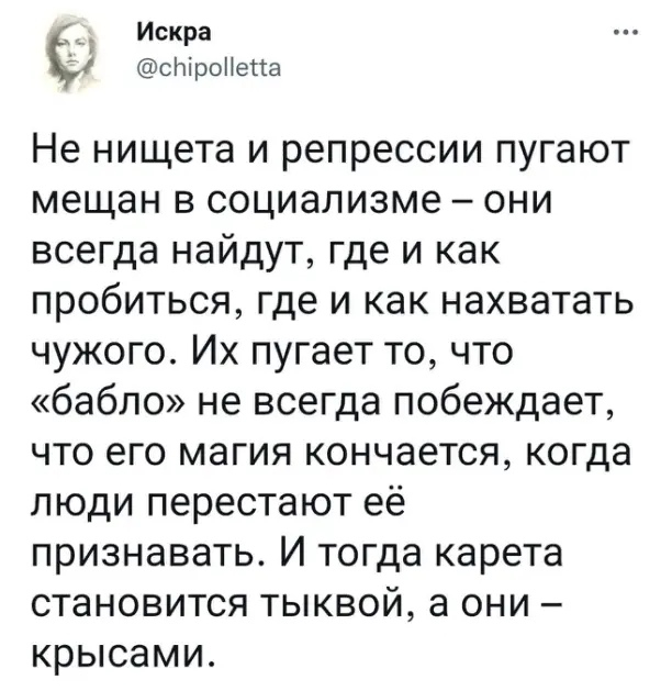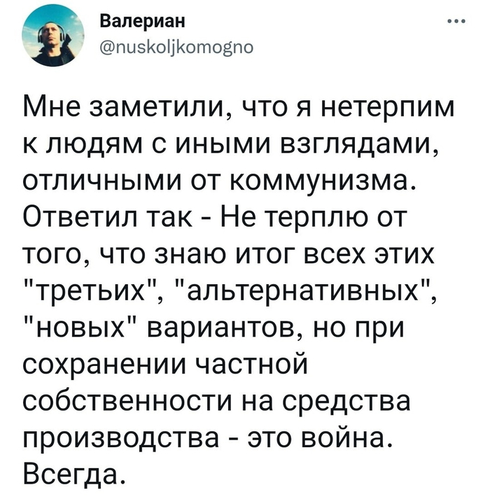 - Социализм (чего уж говорить о коммунизме) - единственная социально-экономическая система, где нужен умный, всесторонне развитый человек, а не тупое абсолютно управляемое быдло.