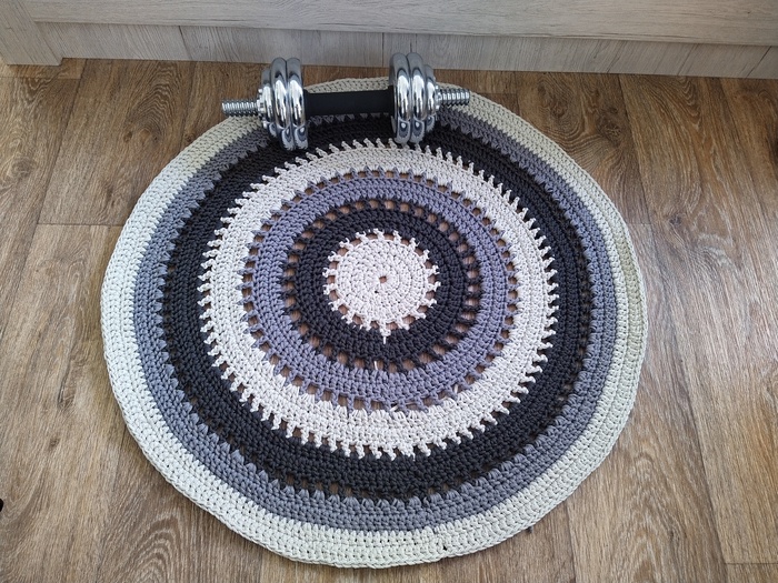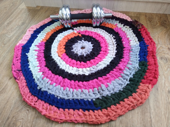 Два коврика связанных мной. Первый из полиэфирного шнура, второй - из DIY пряжи по старинной технологии "нарежем пряжу из тряпья".