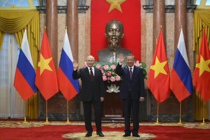 01А, 01Б • Путин приехал к товарищу То Ламу, президенту Вьетнама. Договорились увеличить число авиарейсов, побыстрей достроить Центра ядерной науки, преподавать русский язык в вузах, отказаться от военных блоков в Азиатско-Тихоокеанском регионе, поддержать независимость Палестины, не вводить санкции и создать новую торговую систему на основе правил ВТО.