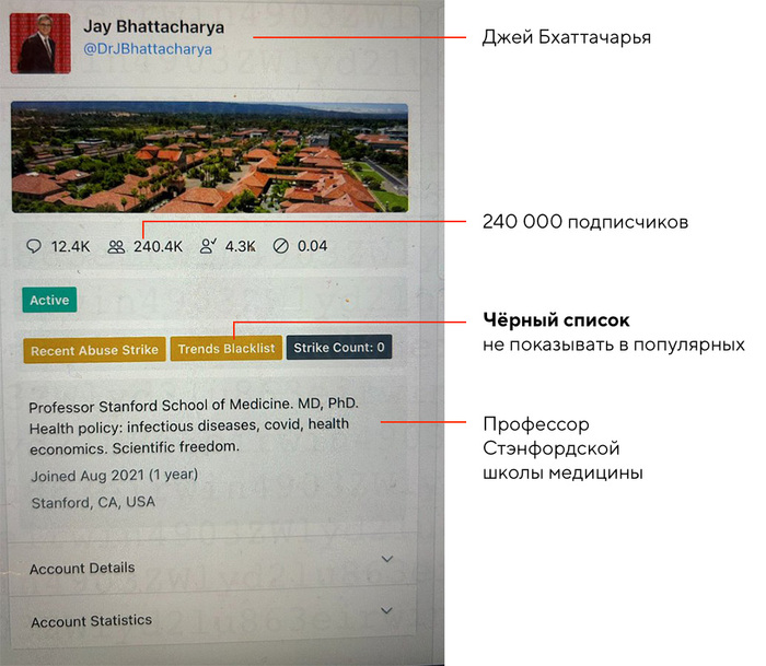 Взгляните, к примеру, на доктора медицинских наук Джея Бхаттачарья, который преподаёт в Стэнфордском университете. Твиттер перестал показывать его сообщения в раздел «популярные темы» после заявления, что «ковидный локдаун может навредить детям»: