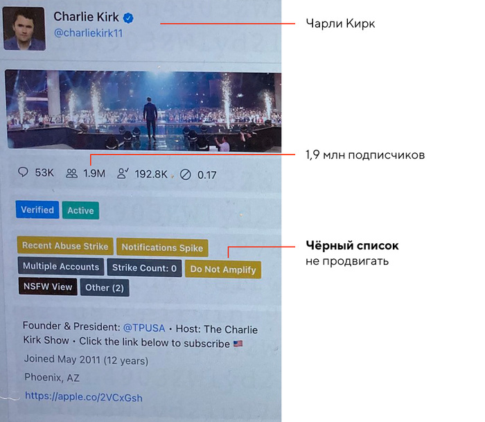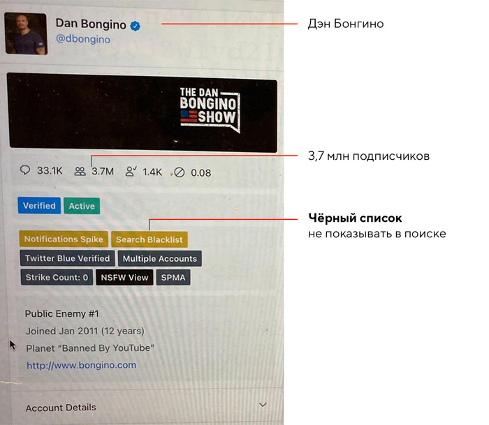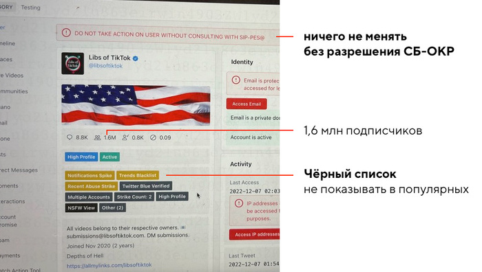 Один из таких аккаунтов — «Либс оф ТикТок», который Чайя Райчик ведёт с 2020 года. У него 1,6 млн подписчиков, он в чёрном списке и с пометкой «ничего не менять без разрешения СБ-ОКР»: