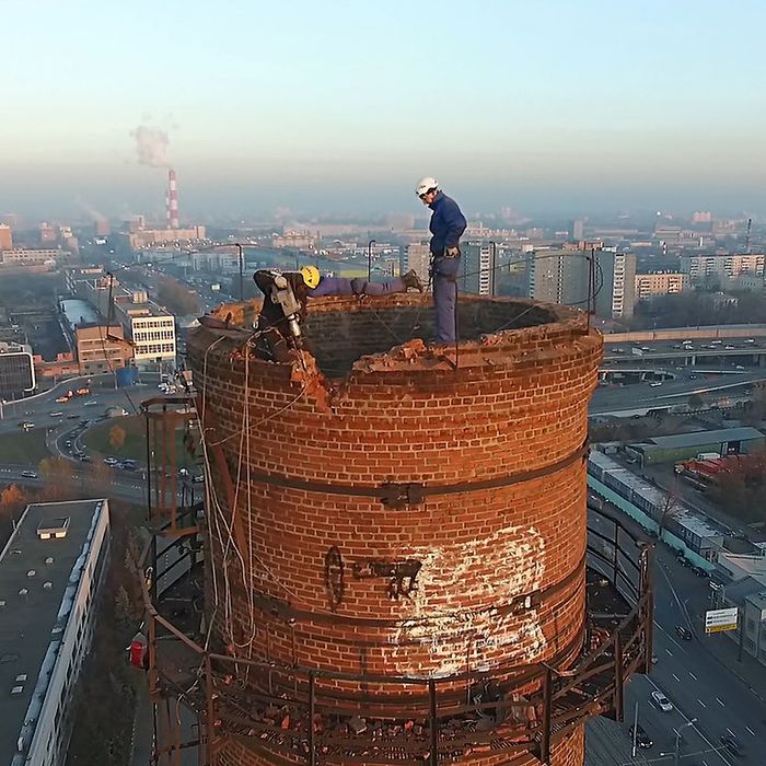 2016 год. Ручной демонтаж 80-метровой дымовой трубы на заводе «Серп и Молот»