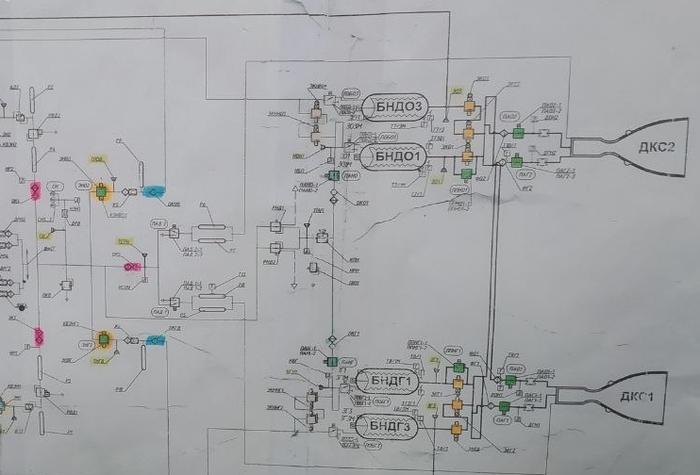 Часть схемы гидравлической и топливной системы модуля МЛМ с четырьмя из шести сильфонных баков: БНДО (бак низкого давления для окислителя), БНДГ (бак низкого давления для горючего). Аббевиатурой ДКС обозначены главные двигатели