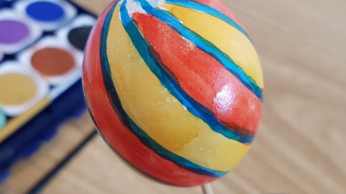 После раскраски ждем пока краска полностью высохнет. Но даже полностью высохшая краска оставляет следы на влажных руках и пальцах. Чтобы яйца не пачкали руки, покрываем их слоем лака для волос. Два слоя оставляют яйцо матовым. Пять и более слоев придают ему глянец.
