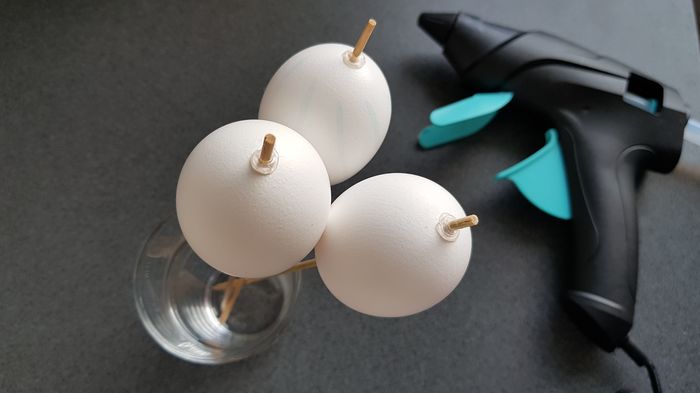 Надеваем яйца на шпажки и приклеиваем с одной стороны пистолетом с горячим клеем.