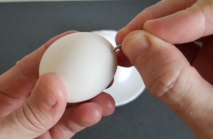 Затем берем маленький гвоздик или толстую иголку и прокалываем скорлупу с двух сторон.