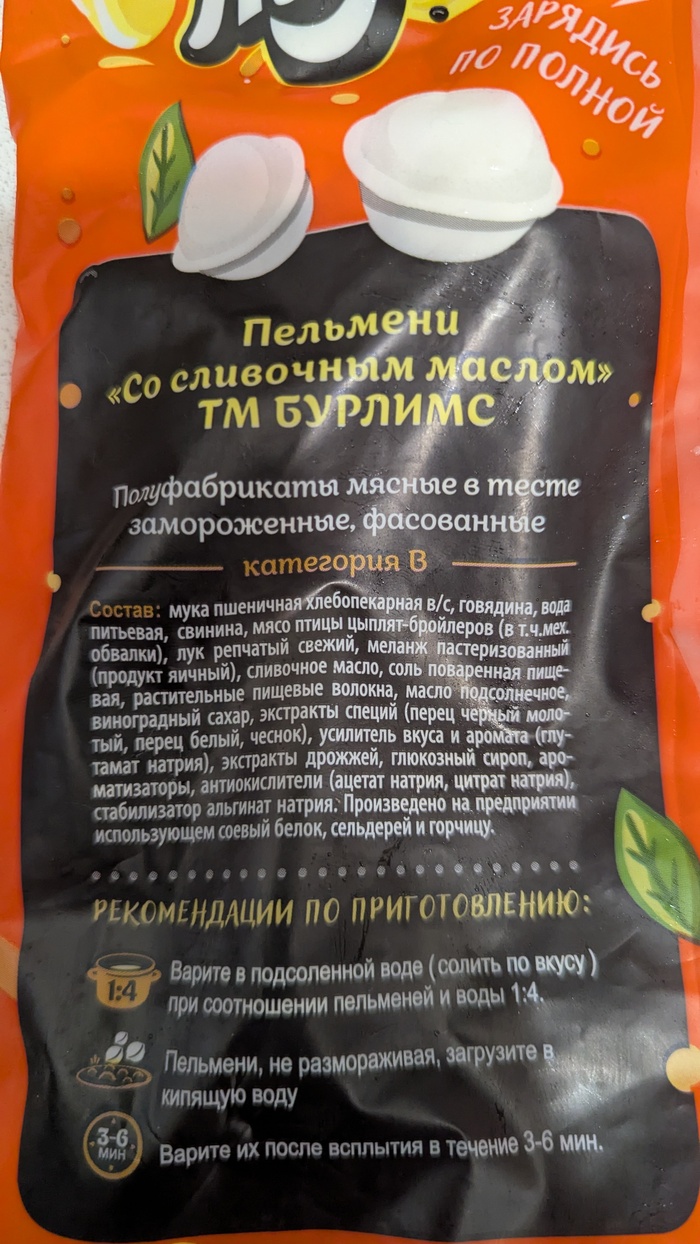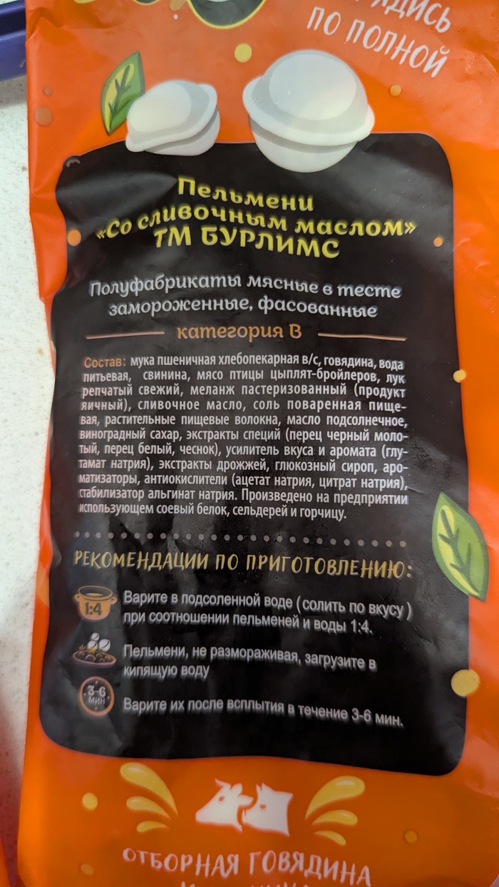 И вот очередное обновление ассортимента, стал покупать пельмени "Бур-лимс" от ООО"Морозофф". Состав пельменей порадовал, мясо мех.обвалки отсутствует, вкусные, в общем стал брать упаковку в неделю.