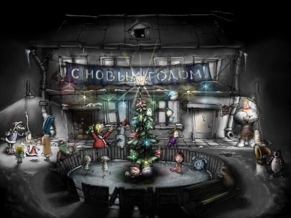 Однажды мне повезло с новогодними праздниками. Я отдыхал 2 недели до НГ, и 2 после. Год 11-12. В мои руки впервые попал планшет. И куча свободного времени! Отлично! Сбегал посмотрел пару уроков. Помазал инструментом "палец" по экрану. Преисполнился в своём величии, как 2д художника, пошёл всех "натягивать"). На ту пору я тусовался на сайте с 3д тематикой, но у них и 2д конкурсы были. Вот в одном таком и решил поучаствовать. Тема: новогодняя открытка. Идея появилась сразу. Давеча наигрался в "машинариум". Блин. Мне от визуала крышу снесло! Тут же про "как достать соседа" вспомнил) и его прошёл. Вощем со стилем, на свежих впечатлениях, определился сразу. Сюжет в голове держу. Картинка в мыслях чёткая. Сажусь за исполнение. И где-то через час, о меня доходит - куда я ввязался,и что я полный ноль в цифровой иллюстрации! Оставалось больше недели. Бегал по тырнету. Где-то чего-то нахватался. Бился как мог. На удивление даже в конкурсе победил! Это был мой четвертый вообще рисунок ))) Но после этой работы пришло безграничное разочарование. Я понял что мало будет понять технику работы на планшете, нужно учить фотошоп. Тогда для меня это был космос. Да и забросил я в сердцах планшет куда подальше.