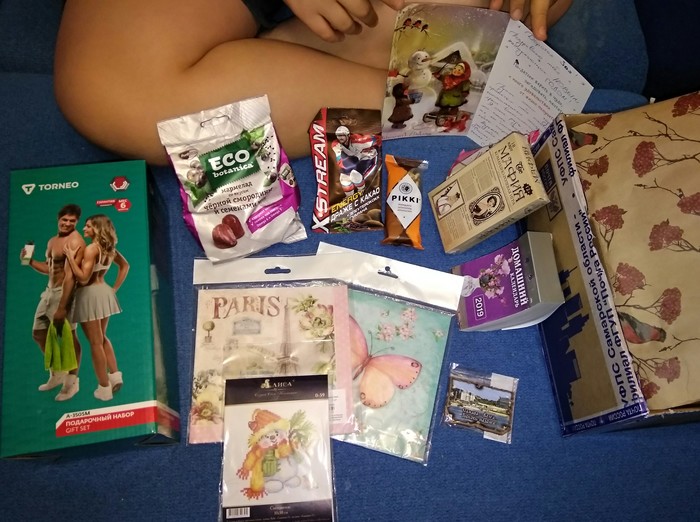 Открытка заняла своё почетное место на полке над телеком - отправилась создавать новогоднее настроение. Сын же потрошил таинственную коробку от вполне себе реального ДМ. Газеты полетели на пол, а содержимое коробки оказалось сладко-заманчиво-разнообразным: