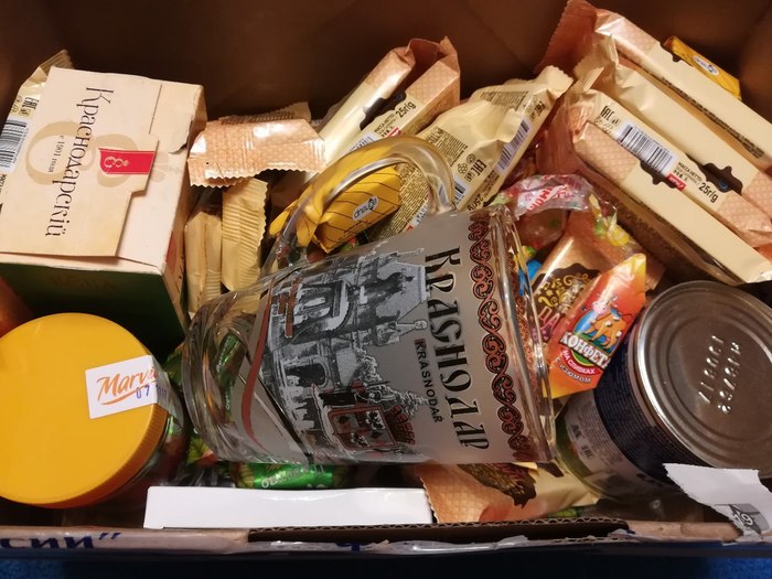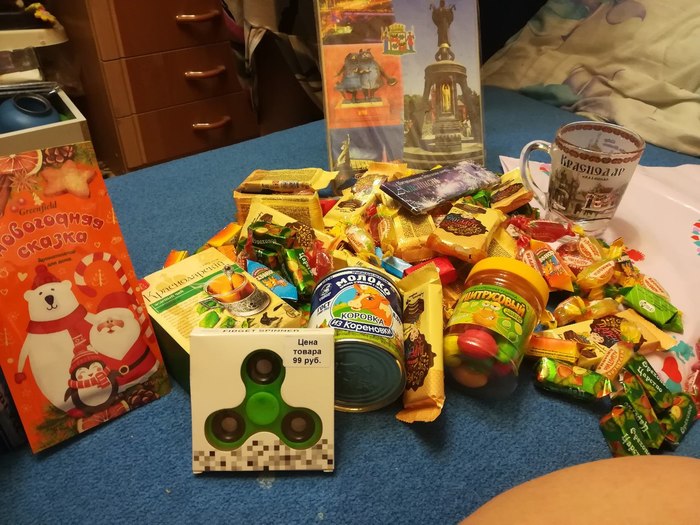 Гора конфет поделена между членами семьи по-братски и частично уничтожена. Краснодарский чай, сгущенка, банка жвачек, бенгальские огни - всему нашлось применение!