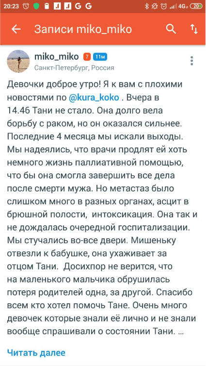 Последний раз, когда она появилась, в ее постах стало много грусти: то с мужем она рассталась, то “болячка вернулась”, подозревая рак. То у сына Миши проблемы с шейным отделом позвоночника. Все дружно сочувствуем Тане: ну а что, опять, денег-то не просит.