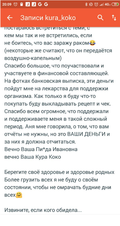 Я одна из первых написала ей в вотсапе, предложила помощь, предложила приехать. Договорились на среду (вторник - похороны Вадима, а число это было 11 июня), то есть должна была я приехать 12 июня. 12 июня утром пишу, а она отменяет встречу по той причине, что свекровь еще не уехала и вообще, она на наркоте (пиздецома, метастазы, не забываем) и паршиво себя чувствует. Договариваемся списаться через пару недель. Параллельно с этим Таня пишет в приложении пост, где благодарит девочеек за переводы денег на похороны мужа. Обещает отчеты за каждую копейку. Буквально настаивает на отчетах)))