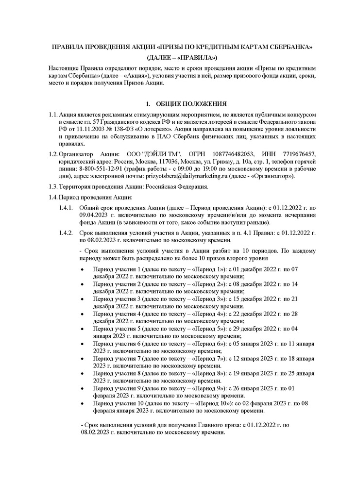 По проведению акции фактически Сбер тут не причём, номинальный организатор акции ООО «Дэйли ТМ», а Сбер только рассылает рекламу на участие в акции. С одной стороны удобно отдать розыгрыш на аутсорс, один раз им перевести деньги и забыть о проблемах, а с другой если что, мы ничего не знаем, это всё они.