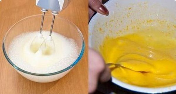 Щепотка соли и туда и туда. Жёлтое - мешаем,белое - взбиваем в пену,как для суфле,но не для суфле.