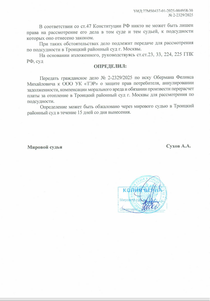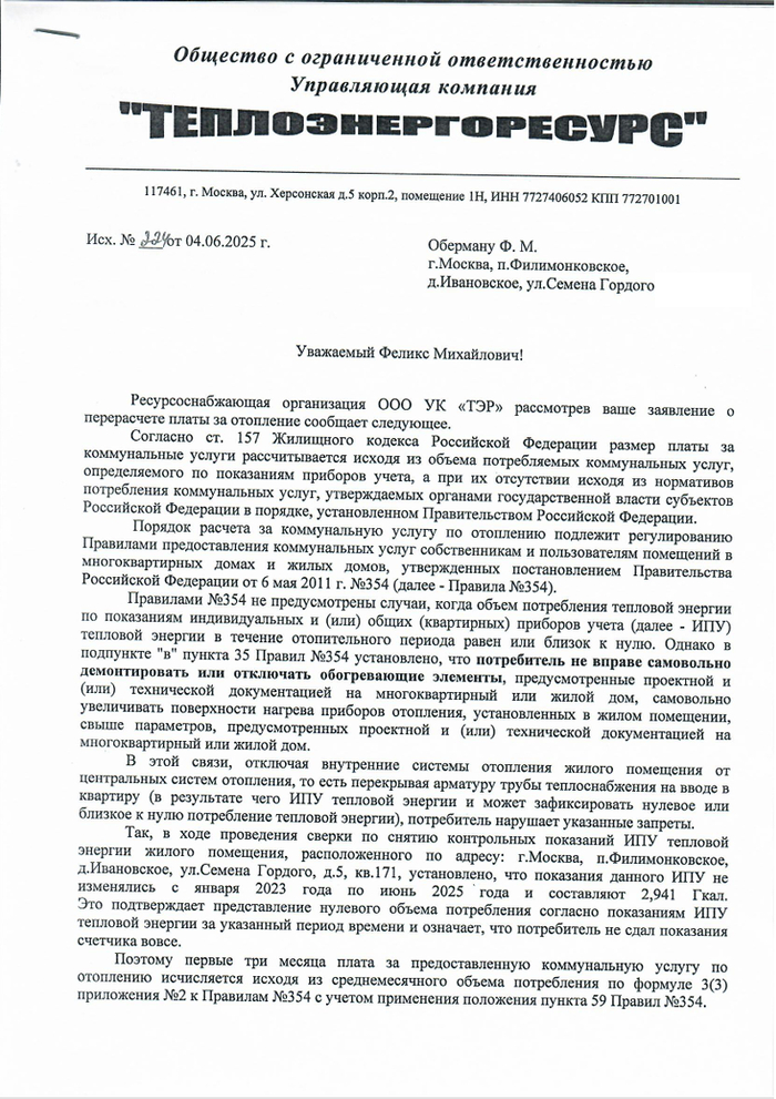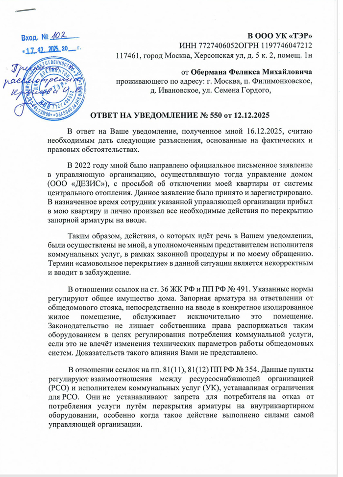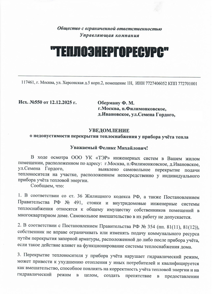 Что по итогу: отопление отключал на основании заявление сотрудник действующего УК и уже более трех лет проблем никто не видел. За три года были акты сверки и ни одного документа, который говорил, что здесь что-то не так, что кто-то что-то нарушил, просто тишина. А потом счет на 50 и не согласие жителя, а когда начинаем по очереди вскрывать факты в рамках гражданского процесса - угрозы. Мне кажется, что в 2026 в Москве это какая-то дичь. Следующее судебное заседание 20.01.2026 в Троицком районном суде города Москвы по делу 02-0653/2026. Посмотрим, что решит суд.