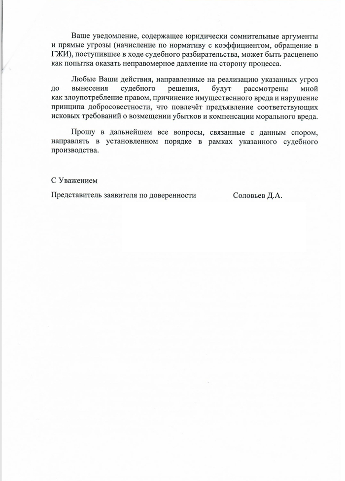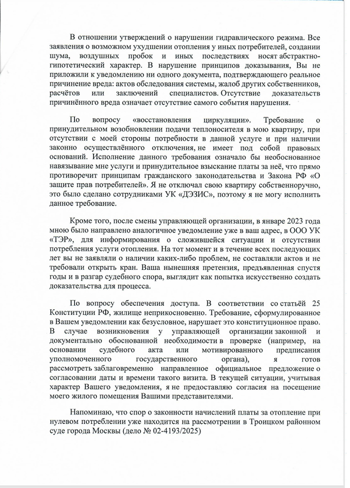 Я им - господа, вас предупредили 3 года назад, что до вас была УК с ней договорились об отключении, вас также уведомили в 2023, вы все эти годы никак не реагировали, ничего не предпринимали, а когда мы пошли в суд и вы начали проигрывать вы вот такое делаете? А вы не совсем охренели? Эмоции в тот момент через уши выливались, пришел, составил ответ, собственно вот он