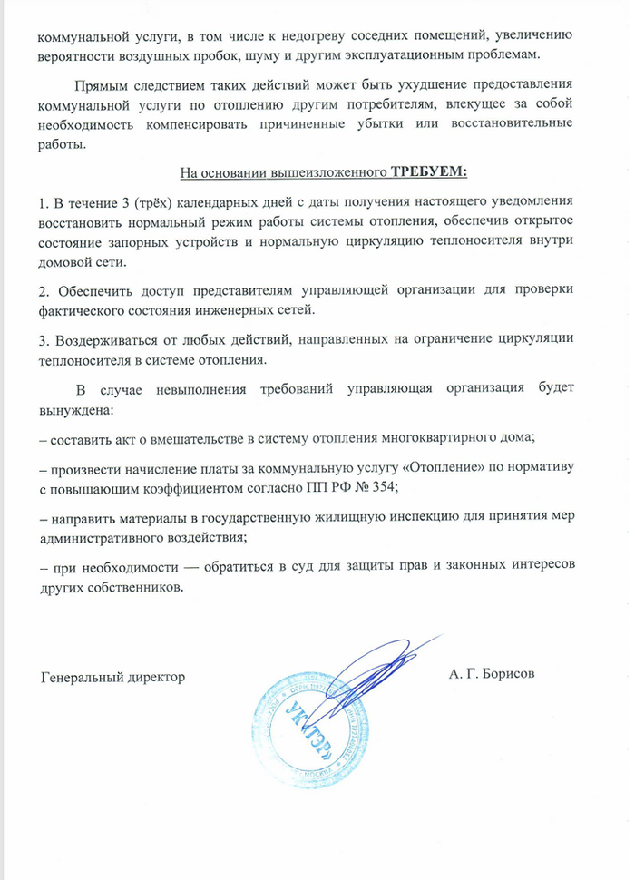 После этого, к нему приходит сотрудник УК и своими руками перекрывает кран (который закрыт до сих пор). В 2023 году происходит переход на прямые договора с РСО (ресурсоснабжающей организацией) и он также сообщает и им