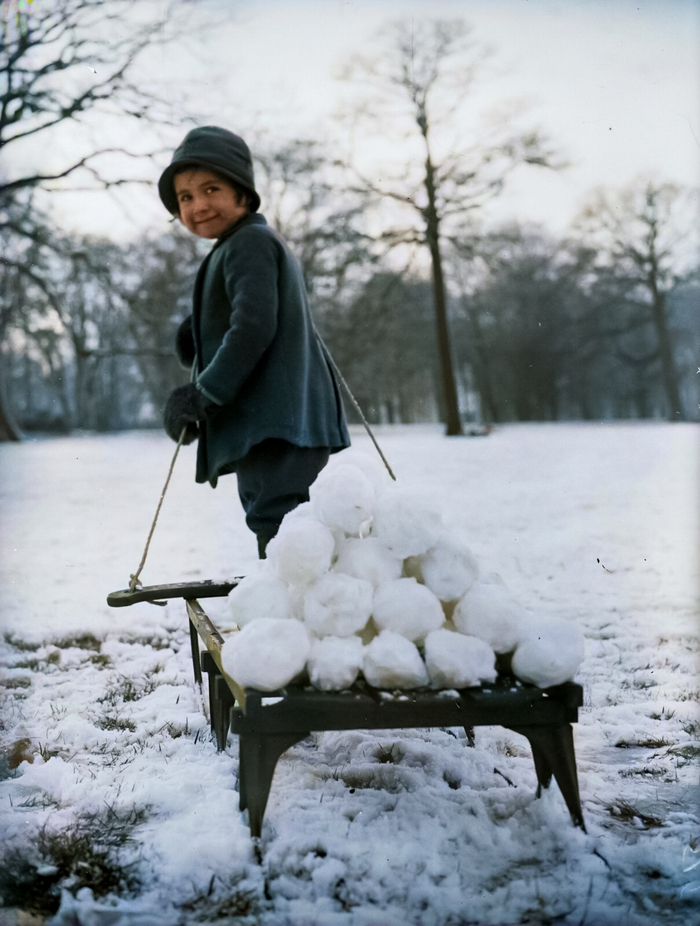Маленькая Гвен Беарн тащит свои сани, нагруженные снежками, по-Лондонскому Хэмпстед-Хиту. Англия, 1931 год.