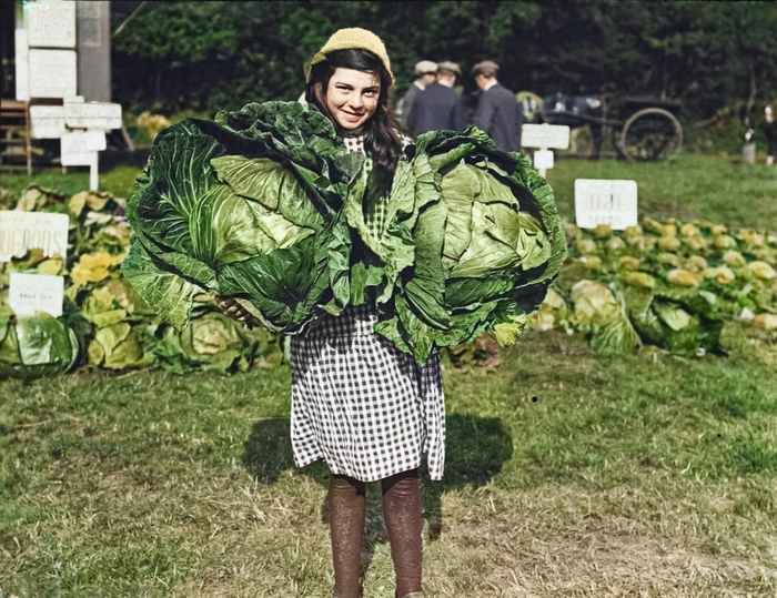 Молодая девушка держит две огромные капусты на сельскохозяйственной выставке. Великобритания, 1922 год.