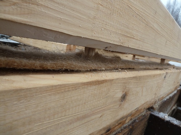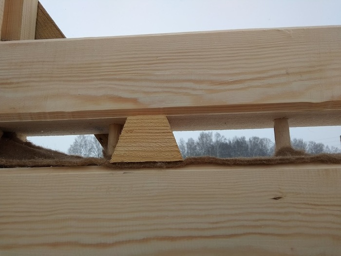 Технология установки на короткие шканты следующая - разметили брус, просверлили отверстия сверху и снизу, вставили шканты, шканты, развернули джутовую ленту.