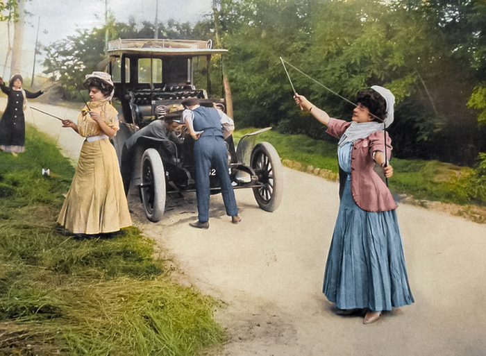 Три женщины играют в диаболо, пока мужчины пытаются починить машину. Англия, 1908 год.