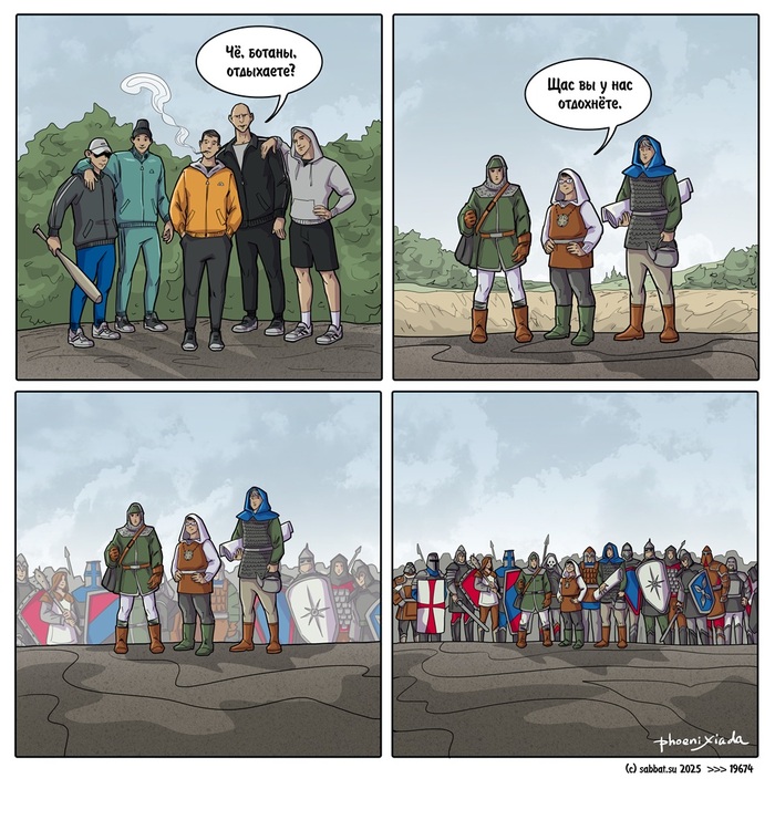 И вот картина - подъезжает грузовик с местными, те неспешно вылезают с каким то дрекольем. Перед ними стоят те два парня, ну и главмастер ботанистого вида. Подходят к ним вальяжненько, а главмастер тем временем медленно поднимет руку. И из поля встает сотни полторы наших, в доспехах, с мечами и щитами. Красиво было, мы их даже побить особо не успели.
