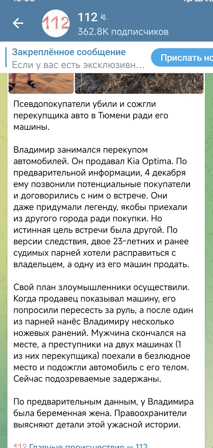 30‑летний Владимир из Тюмени выставил на продажу Kia Optima. 4 декабря с ним связались потенциальные покупатели. Поздно вечером в тот же день мужчина вышел из дома на улице Монтажников, к зданию подъехали двое на ВАЗ‑2110 без номеров. Владимир и мужчины заехали на Ладе за угол и, вероятно, поехали прокатиться на Optima. Больше живым Владимира никто не видел.
