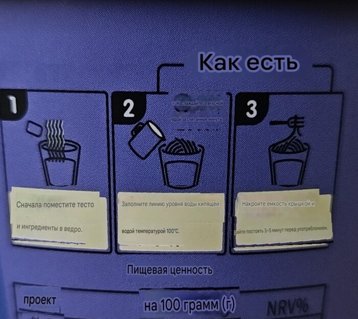 Изучив всё это великолепие, уже порядком проголодавшись, приступаем к приготовлению. Инструкция для всех трёх видов лапши одна и та же. Я, как обычно, держу средний временной диапазон из указанного. В данном случае 4 минуты. Также отмечу, что отметка уровня воды указана снаружи стакана и показывает нам уровень, практически вровень с краем.