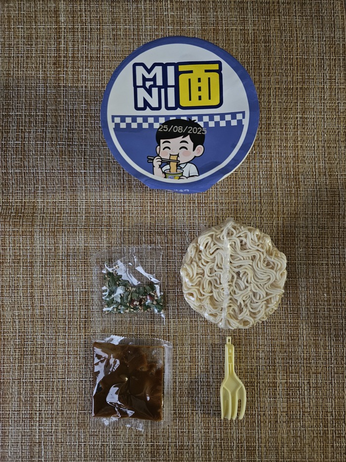 Наполнение сушёными овощами также различно. У лапши со вкусом свинины зеленый лук, морковь, кукурузка и пара кусочков соевого мяса. Лапша с морепродуктами имеет больше моркови. Кукуруза также присутствует. Помимо этого там же имеются водоросли и нарутомаки. В чесночной лапше тот же лук (хотя в составе написано кориандр), кунжут и ягоды годжи.