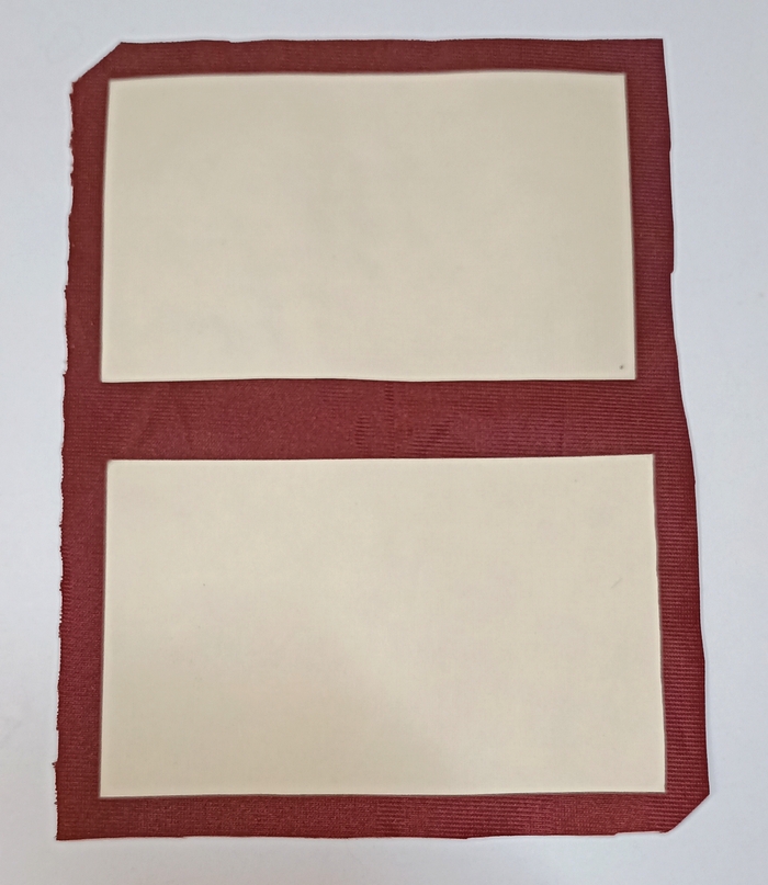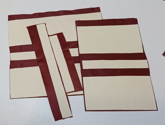 Шаг второй: наклеиваем детали на ткань так, чтобы у донышка и крышки со всех сторон была прибавка ткани 8-10 мм, а у бортиков - с одной стороны. Ещё нам понадобится отдельная полоска ткани без бумаги, призванная свободно сгибаться и прикрывать петли.