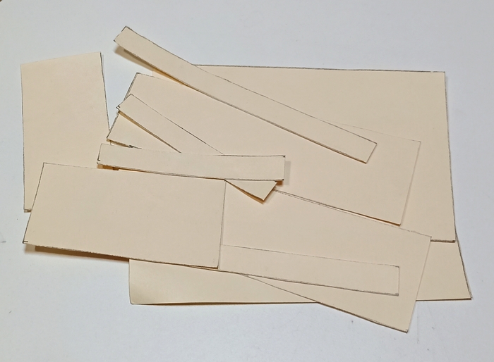 Шаг четвёртый - каждую деталь нужно перед наклеиванием примерить на будущее "посадочное место". Сначала бортики. По ширине деталь должна помещаться с напряжением, в распор - но без того, чтобы деформироваться. Если будет чуть меньше - есть опасность, что где-то полмиллиметра не хватит и будет видно щель. Так что каждый прямоугольничек вставляем, изначально он либо впору (мы же внимательно мерили и чертили, да?), либо не входит - подрезаем буквально по миллиметру, пока не будет плотно входить.