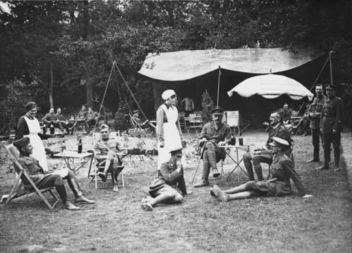 К фото - На этой фотографии изображены американские офицеры (слева) и британские офицеры (справа), пьющие пиво c британскими медсестрами во время увольнения с фронта в 1918 году. Поскольку американские военные не получали алкоголь в своем пайке, выпивка в тылу была единственным вариантом, который оставался у "джи-ай".