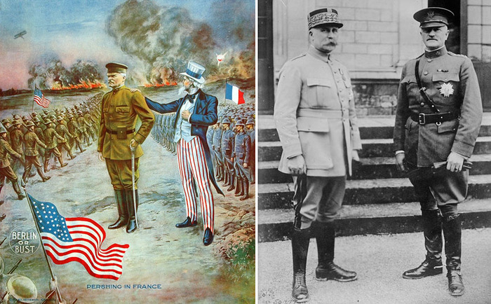 На заставке слева - американский пропагандистский плакат 1917 года, на котором Дядя Сэм благословляет командующего экспедиционными силами США в Европе, генерала Першинга и его парней на войну с Германией. Справа - Першинг и французский главком, маршал Петен. Кто бы мог подумать, что спустя четверть века они окажутся по разные стороны линии фронта.