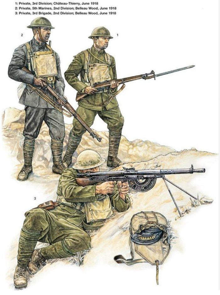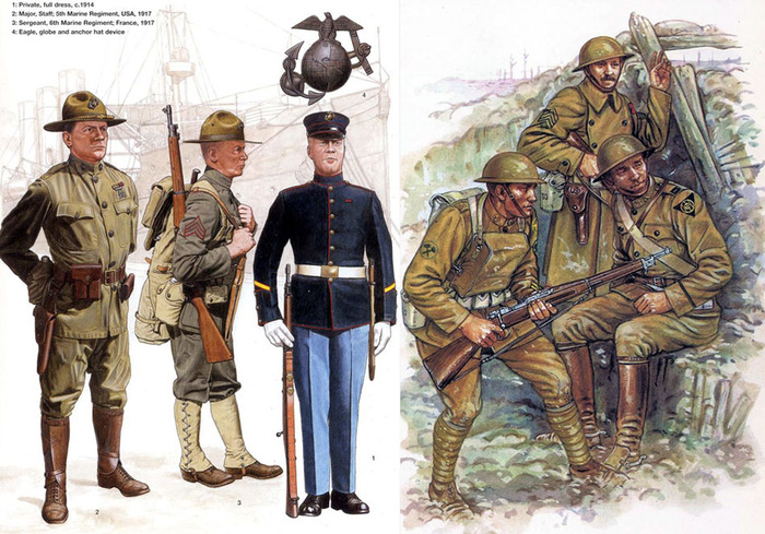 Обмундирование американских морпехов и просто пехотинцев, первыми вступивших в бой за Европу в 1917 году.